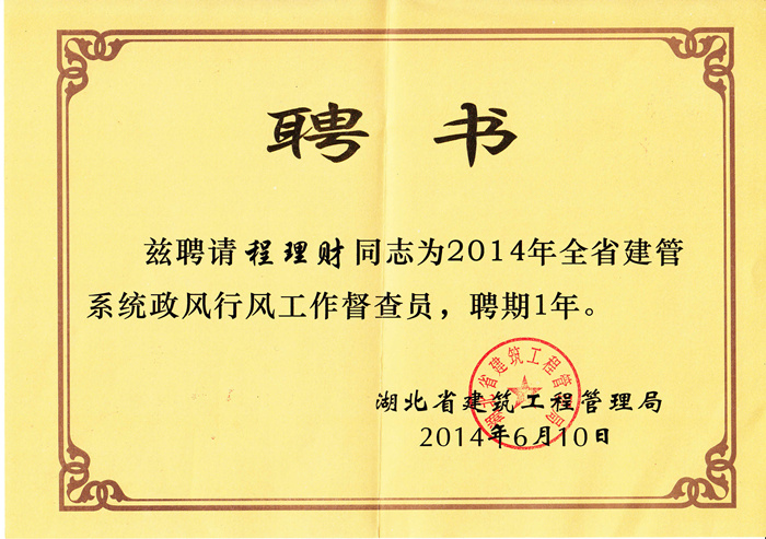 博鱼网页登陆_博鱼(中国)博鱼网页登陆_博鱼(中国)董事长程理财同志 被聘请为全省建管系统政风行风工作督查员