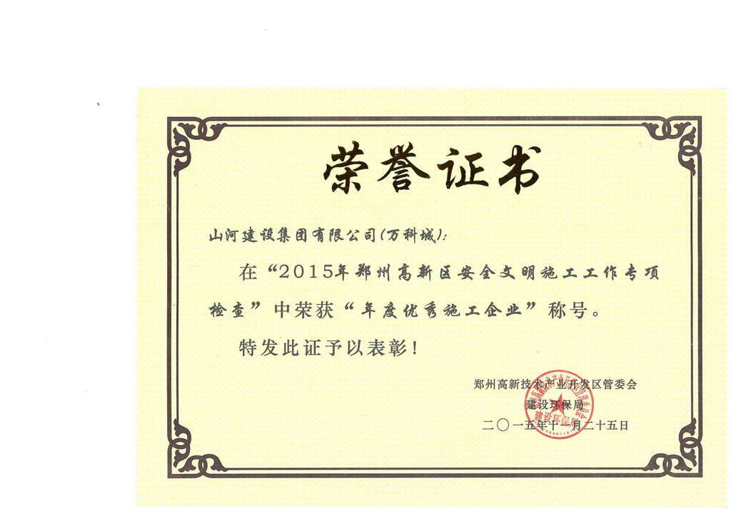 11月25日,在郑州高新区安全文明施工专项检查中,博鱼网页登陆_博鱼(中国)建设博鱼网页登陆_博鱼(中国)有限公司荣获由郑州高新区管理会建设环保局授予的“年度优秀施工企业”荣誉称号。