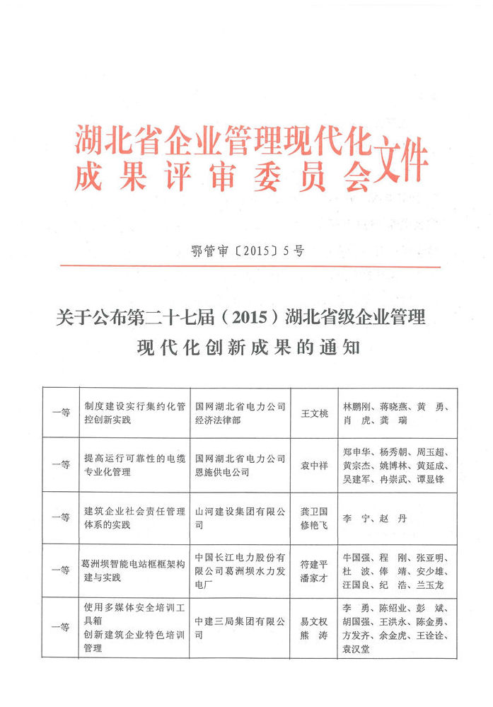 2015年12月25日,湖北省第二十七届(2015)企业管理现代化创新成果名单公布,博鱼网页登陆_博鱼(中国)博鱼网页登陆_博鱼(中国)申报的《建筑企业社会责任管理体系的实践》成果荣获一等奖。