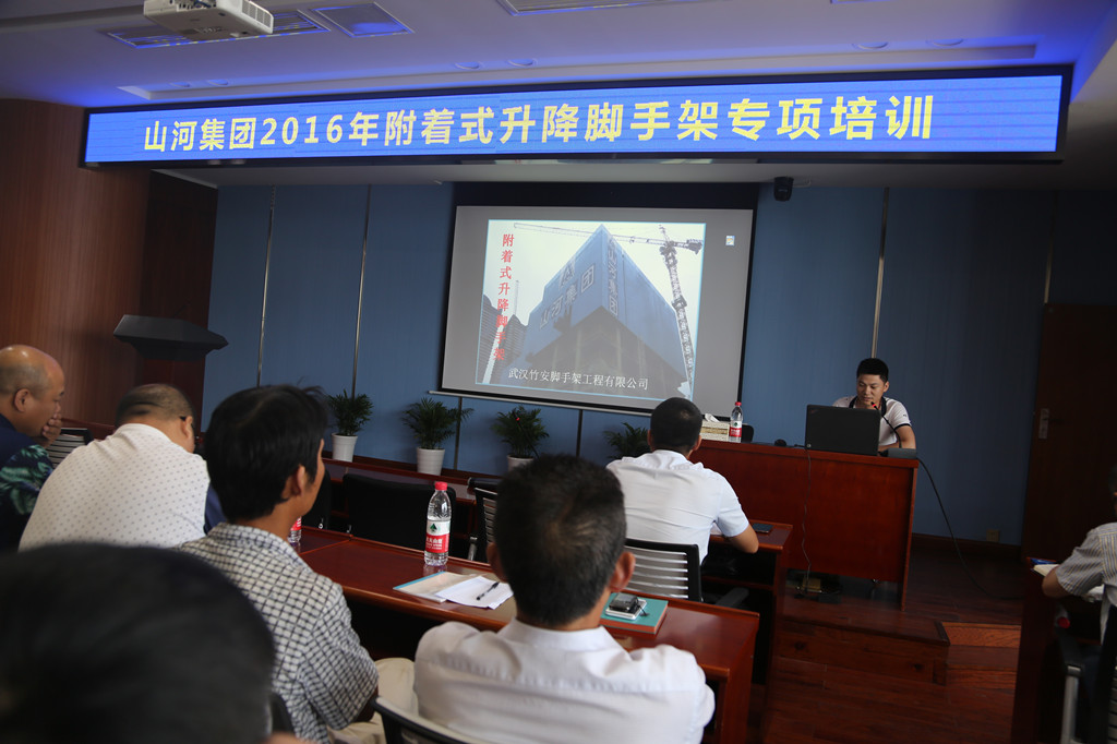 本次会议特邀武汉竹安脚手架工程有限公司技术科周乔进行专题授课。会上,周乔从附着式升降脚手架的规范要求、结构构造、安装及升降操作等方面进行了详细的讲解,并就施工现场中常见的脚手架搭设安全隐患进行了举例说明。