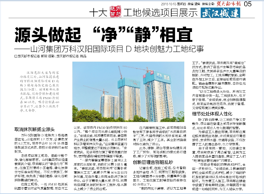汉阳龙阳大道与陶家岭路交汇处,博鱼网页登陆_博鱼(中国)博鱼网页登陆_博鱼(中国)承建的万科汉阳国际项目D地块3栋超高住宅楼已巍然挺立。该项目部从源头抓起,创新管理和建造模式,长期将工地PM10控制在80以内,噪音控制在60分贝以下,让整个工地既干净,又安静。