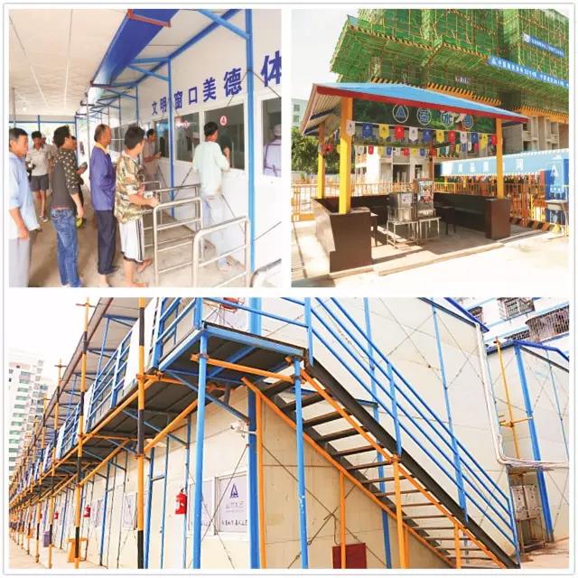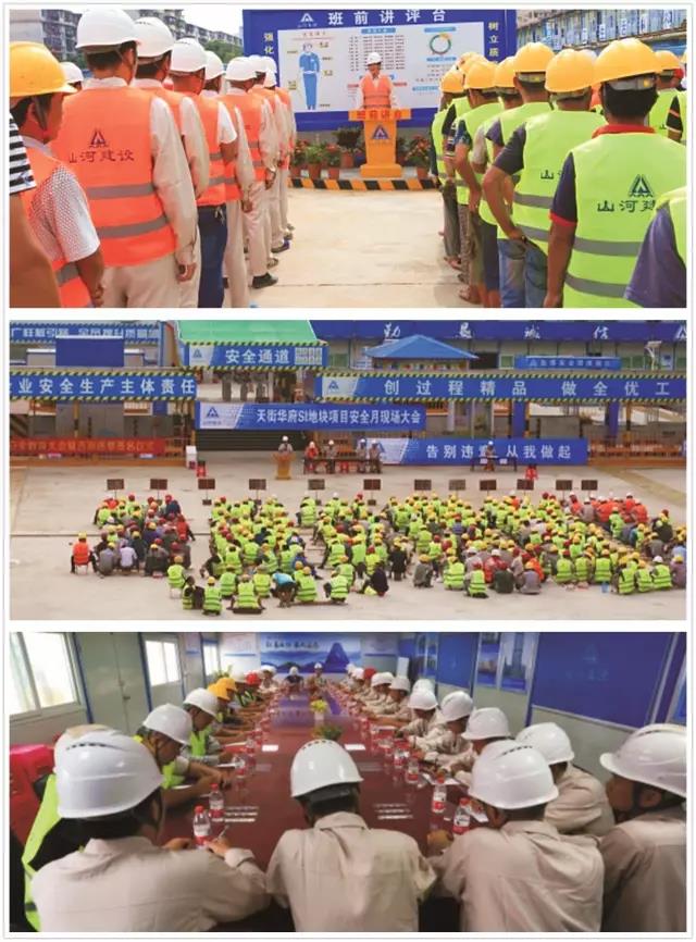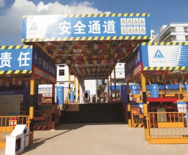 规范化的安全文明施工。项目部在安全教育方面采取多种形式,如:每日晨会进行班前讲评,实行告别违章承诺签名,设置高空坠落、安全带、安全帽、平衡木体验区等。在安全防护方面,项目部严格按照安全文明施工方案搭建了安全防护设施。此外,项目部设立了会议室、茶水间、休息室、宿舍区等场地;构建了楼层临时消防、灭火器、消防水泵系统;项目部出入口实行人车分道, 24小时值班制,并设置视频监控,提供了舒适、安全、完善的施工环境。