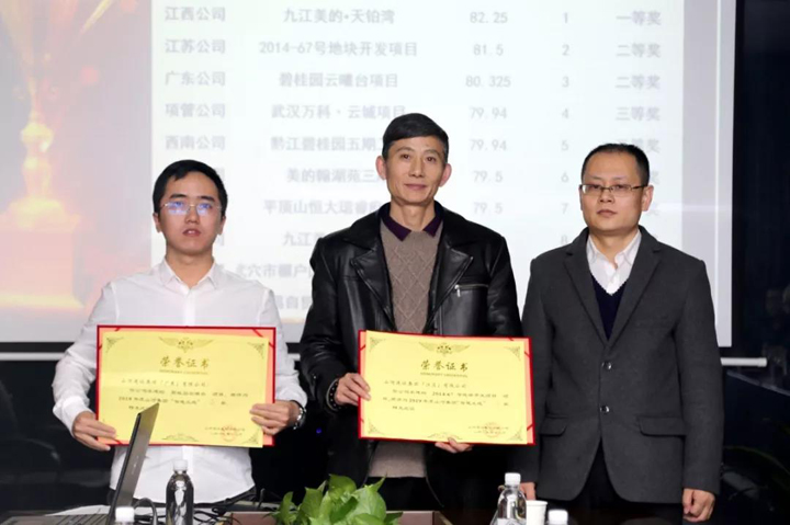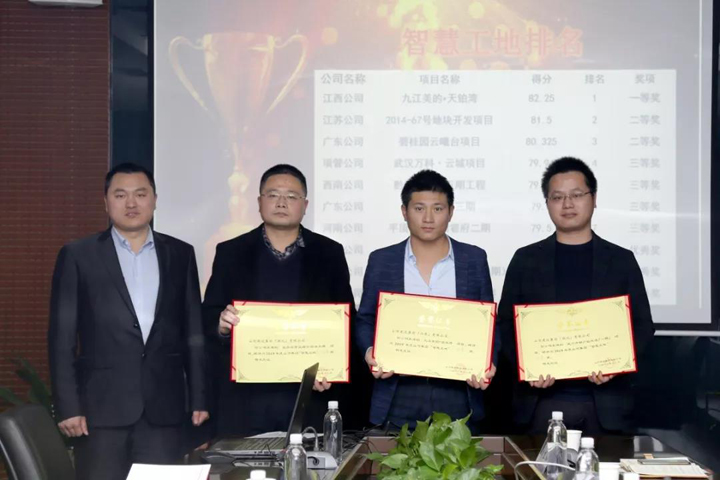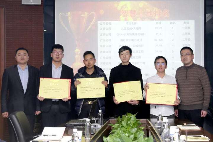 江西公司九江美的•天铂湾项目荣获智慧工地一等奖;江苏公司2014-67号地块开发项目、广东公司碧桂园云曦台项目荣获智慧工地二等奖;项目管理公司武汉万科·云城项目、西南公司黔江碧桂园五期工程、广东公司美的翰湖苑三期工程、河南公司平顶山恒大珺睿府二期工程荣获智慧工地三等奖;江西公司九江美的•国宾府项目、湖北公司武穴市棚户区改造项目(一期)、湖北公司宜昌自贸区综合服务大楼项目荣获智慧工地优秀奖。