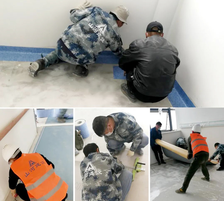 施工现场,多类工种各司其职,抢抓建设。突击队到达后,承担起医院住院大楼的部分地面铺装任务,需要铺装地板胶的面积约3600平方米。分配好工作任务,大家立即投入到紧张的施工中,清洁地面、检测地坪、预铺裁割、上胶、滚压,每一道工序都一丝不苟。时间紧、任务重,那就加班加点,即使再苦再累,也要按照时间节点保质保量完成施工目标,这是博鱼网页登陆_博鱼(中国)人一贯的作风。