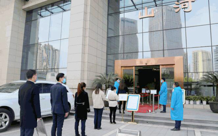 物业服务中心加强对进出车辆及人员的管控,大厦地库通往写字楼的进出口暂时封闭,大堂出入口分开设置。返岗人员均需提前进行登记审核,手机出示准许进入的绿色登记码,统一从大堂入口经测温、消毒后有序进入。