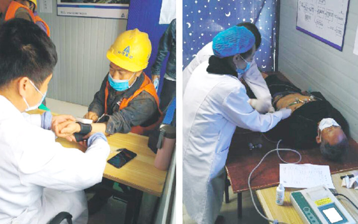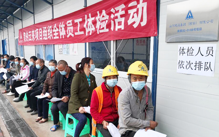 由重庆聚宁医院的医师和工作人员组成的七人体检团队来到工地,为大家进行了体温、血常规、心电图、生化检查、内外科常规检查、视力等项目的检查。体检过程中,有专人负责维护排队的安全距离,避免交叉感染风险。