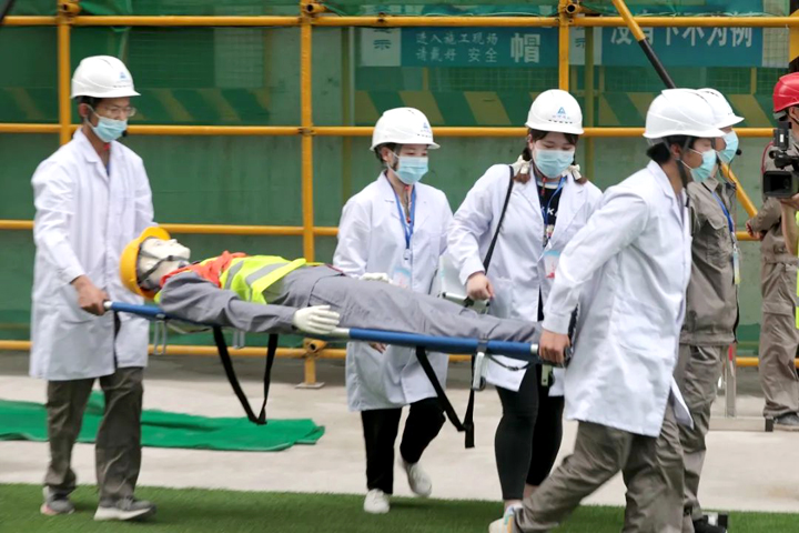 项目经理发出指令,立即启动应急救援预案,同时拨打120求助,并向上级单位报告。警戒隔离组、抢险救援组、医疗救护组先后进入事发区域,拉设警戒区,检查伤者情况并进行初步包扎处理,撤离作业人员,将伤者抬上担架送上救护车,一系列行动有力有序,“受伤工人”得到了及时救治。