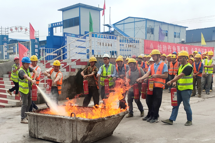 活动现场,项目管理人员、劳务施工人员整齐列阵,相关负责人讲解了有关火灾现场的应急处置方案,灭火器的原理、基本操作方法、注意事项等。演练人员按照预案,使用水枪、灭火器对“起火点”进行灭火操作,熟练掌握了消防器材的使用方法。