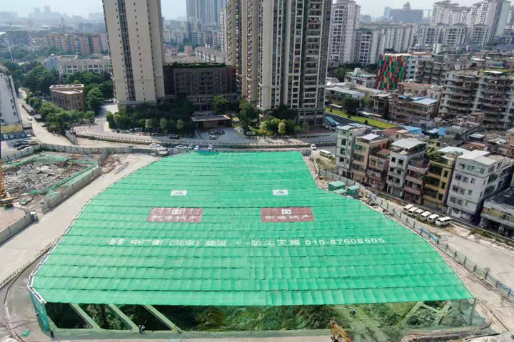 石岗路项目位于广州市海珠区石溪村得宝球场旁,邻近地铁10号线石溪站,总建筑面积约6.5万平方米,包括3栋36层、建筑高度116.2米的高层住宅。工程周边环境复杂、裸土面积大、施工工序多,大跨度防尘天幕系统的启用,开创了广州基坑工程“全封闭”施工的先河。