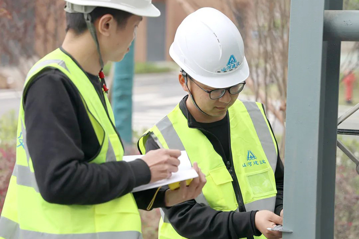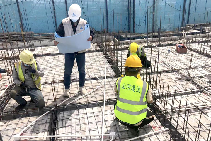▲郑州金地拾光春晓园项目管理人员现场核对钢筋