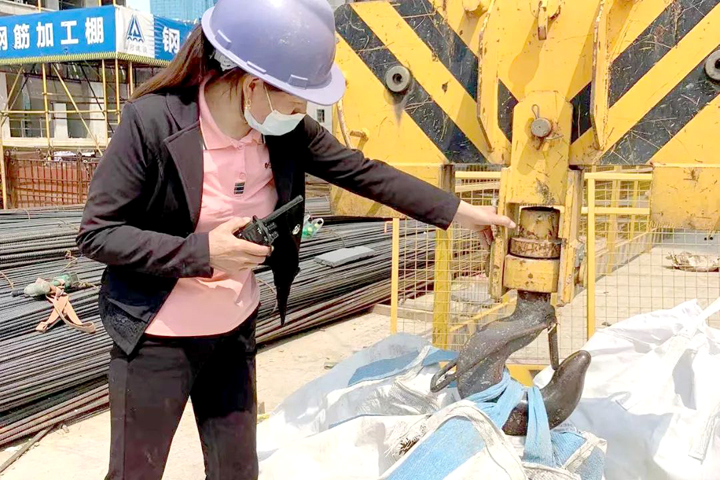 ▲居住项目(湖北交投产城华园二期)塔吊指挥员在吊装前对起重设备吊具进行自检