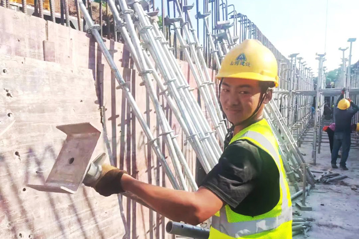 ▲重庆鹿角R1道路项目施工人员在进行道路箱涵模板支撑搭设