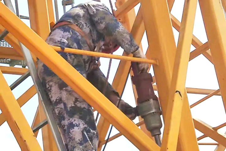 ▲定安牧屿云天项目塔吊安拆工在做拆除塔吊前的准备工作