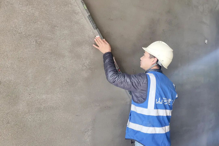 ▲新余联发永康状元府项目实测员在检查墙面平整度