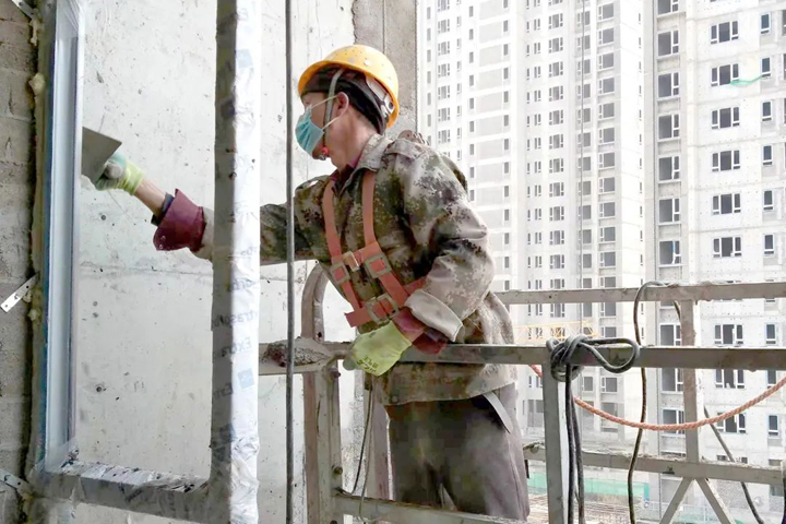 ▲西安龙发天泉湾项目工人在给窗框收口抹灰