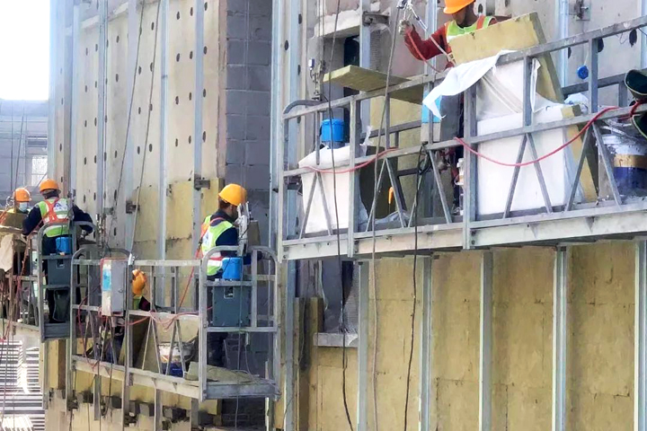 ▲天津华测仪器仪表制造项目工人在进行外墙施工
