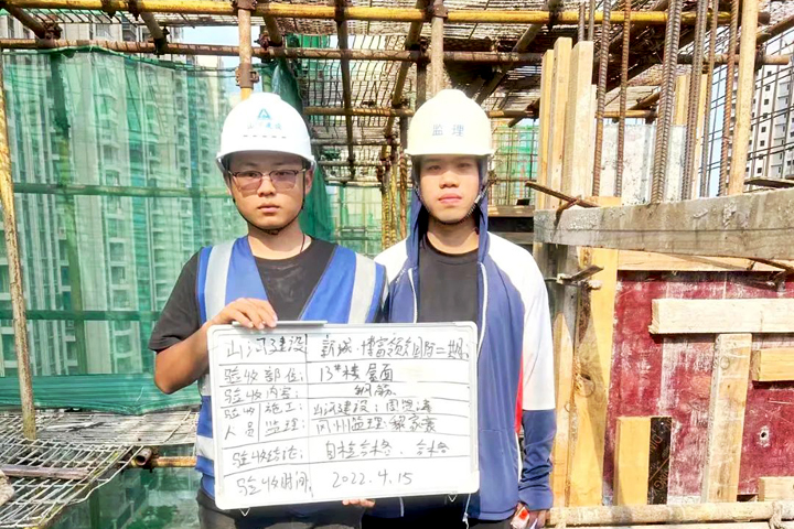 ▲江门市新城博富领会国际二期项目代表和监理单位代表举牌验收