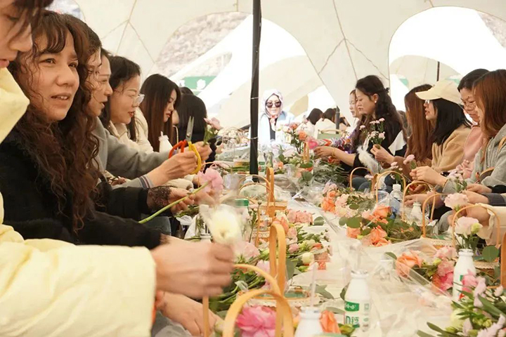 游览结束后,大家来到月亮湾露营基地,进行韩式手提花篮DIY活动。在专业花艺老师的指导下,大家重新组合手中的小雏菊、康乃馨、玫瑰、洋桔梗等花材,充分发挥想象力和创造力,修剪枝叶、搭配色彩、设计造型,一株株鲜花变身成为绚丽的花篮。通过这次DIY活动,不仅令人减压赋能、陶冶情操,而且在馥郁花香中感悟取舍之道,领会生活之美。