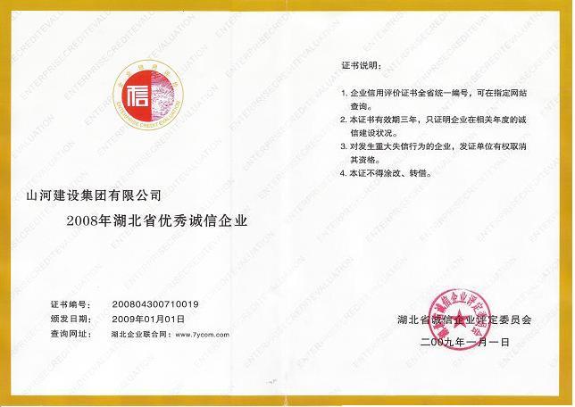 湖北省企业联合会和湖北省企业家协会于2009年元月1日发布2008湖北省优秀诚信企业名单,博鱼网页登陆_博鱼(中国)博鱼网页登陆_博鱼(中国)再度金榜题名。自元月份以来,博鱼网页登陆_博鱼(中国)博鱼网页登陆_博鱼(中国)已经获得了纳税信用等级A级纳税人、湖北省建筑业企业综合实力20强、武汉地区建筑业优秀企业等多个荣誉。此次获奖可谓锦上添花,更是对博鱼网页登陆_博鱼(中国)博鱼网页登陆_博鱼(中国)诚信经营理念的肯定。